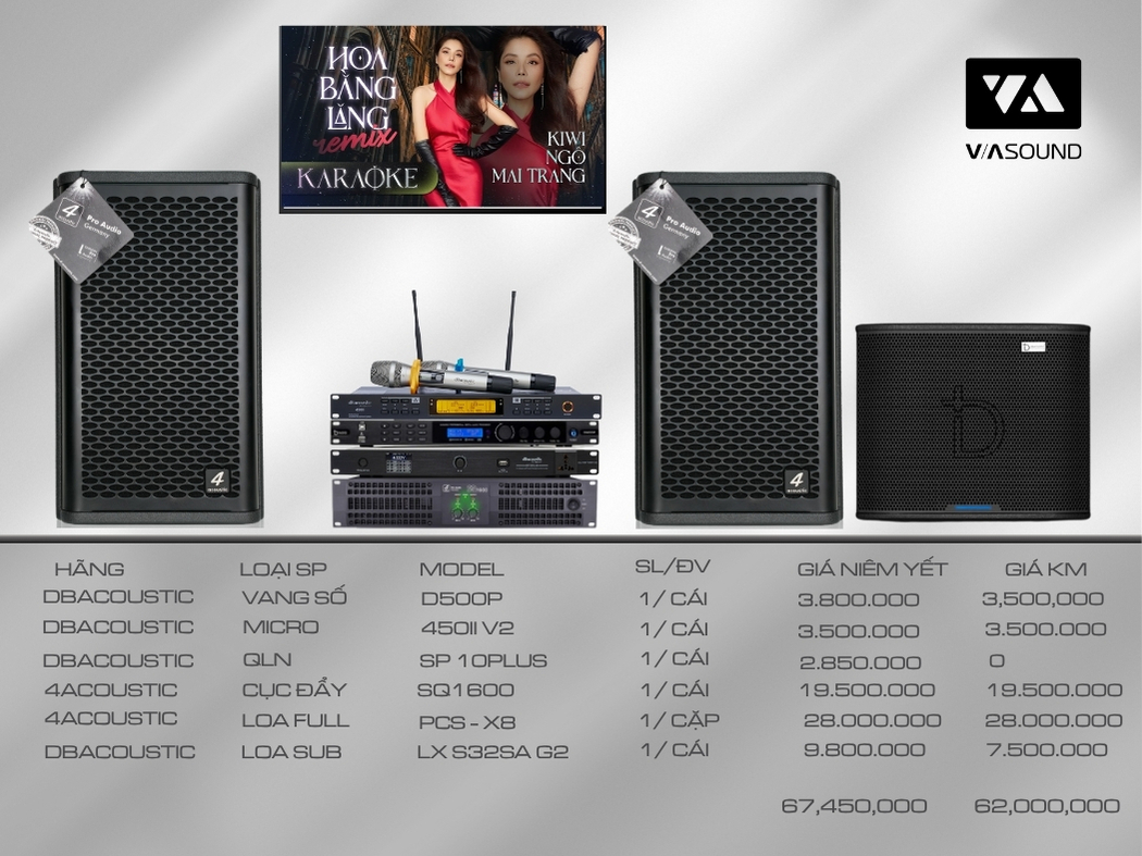 VANG SỐ DBACOUSTIC D500P + MICRO DBACOUSTIC DB 450II V2 + CỤC ĐẨY 4ACOUSTIC SQ1600 + QUẢN LÝ NGUỒN DBACOUSTIC SP 10PLUS + LOA 4ACOUSTIC PCS – X8 + LOA SUBWOOFER 4ACOUSTIC LX S32SA G2