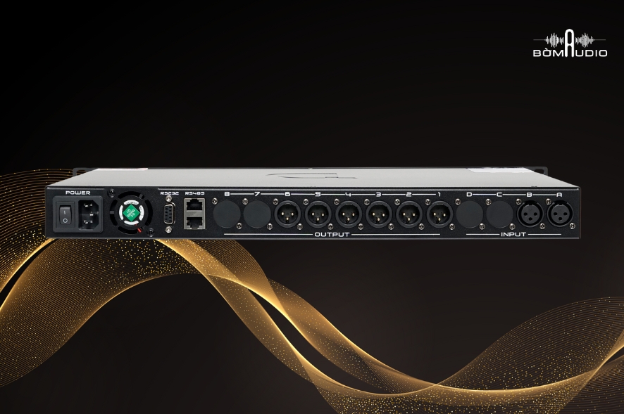 Nút xoay trung tâm cùng các nút nhấn vật lý được bố trí logic, thao tác mượt mà. Hệ thống đèn LED tín hiệu hiển thị rõ ràng theo từng kênh, giúp kỹ thuật viên hoặc người dùng kiểm soát tín hiệu âm thanh nhanh chóng. Mặt sau trang bị đầy đủ cổng kết nối XLR vào/ra, được chú thích rõ ràng, hỗ trợ đấu nối thuận tiện và chính xác.