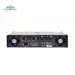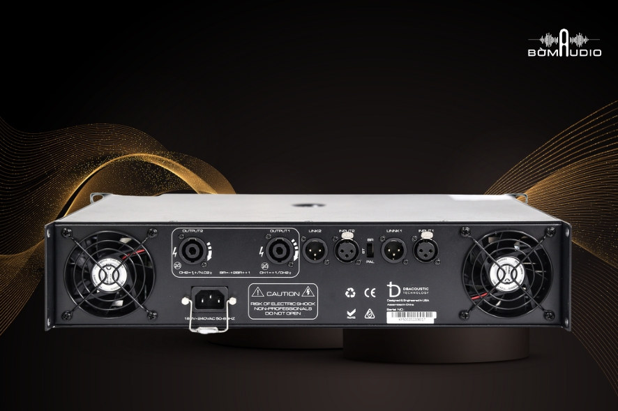 Mặt trước được trang bị công tắc nguồn, hai núm vặn điều chỉnh riêng cho từng kênh và hai dãy LED hiển thị tín hiệu, cùng lưới chắn gió bảo vệ linh kiện. Mặt sau bố trí đầy đủ cổng kết nối và thông số kỹ thuật khoa học, giúp phối ghép nhanh chóng với các thiết bị khác. Hệ thống quạt tản nhiệt hoạt động hiệu quả, đảm bảo thiết bị luôn mát và ổn định ngay cả khi chạy công suất lớn trong thời gian dài.
