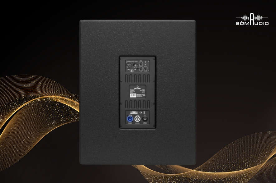 Phía sau loa bố trí các cổng kết nối XLR và PowerCON, cùng nút điều chỉnh âm lượng và tần số cắt, giúp người dùng dễ dàng thao tác và phối ghép với các thiết bị khác, tối ưu hóa trải nghiệm âm thanh cho phòng karaoke, sân khấu hay dàn âm thanh chuyên nghiệp.